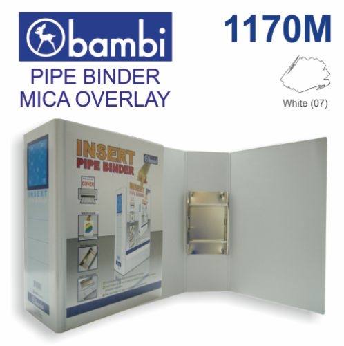 Bambi Pipe Binders dengan tambahan kantung mika pada cover depan terbuat dari sebidang kardus yang kuat dan tahan lama, yang kemudian dilaminasi dengan selembar berkualitas tinggi PVC. Dilengkapi dengan empat warna yang berbeda coding pada label. Yang paling penting adalah mekanisme pipa yang kuat dipasang di bagian belakang sehingga dokumen bisa dimuat lebih banyak . kapasitas 100mm, Spine 12 cm, 12 pcs per kemasan. Ukuran A4